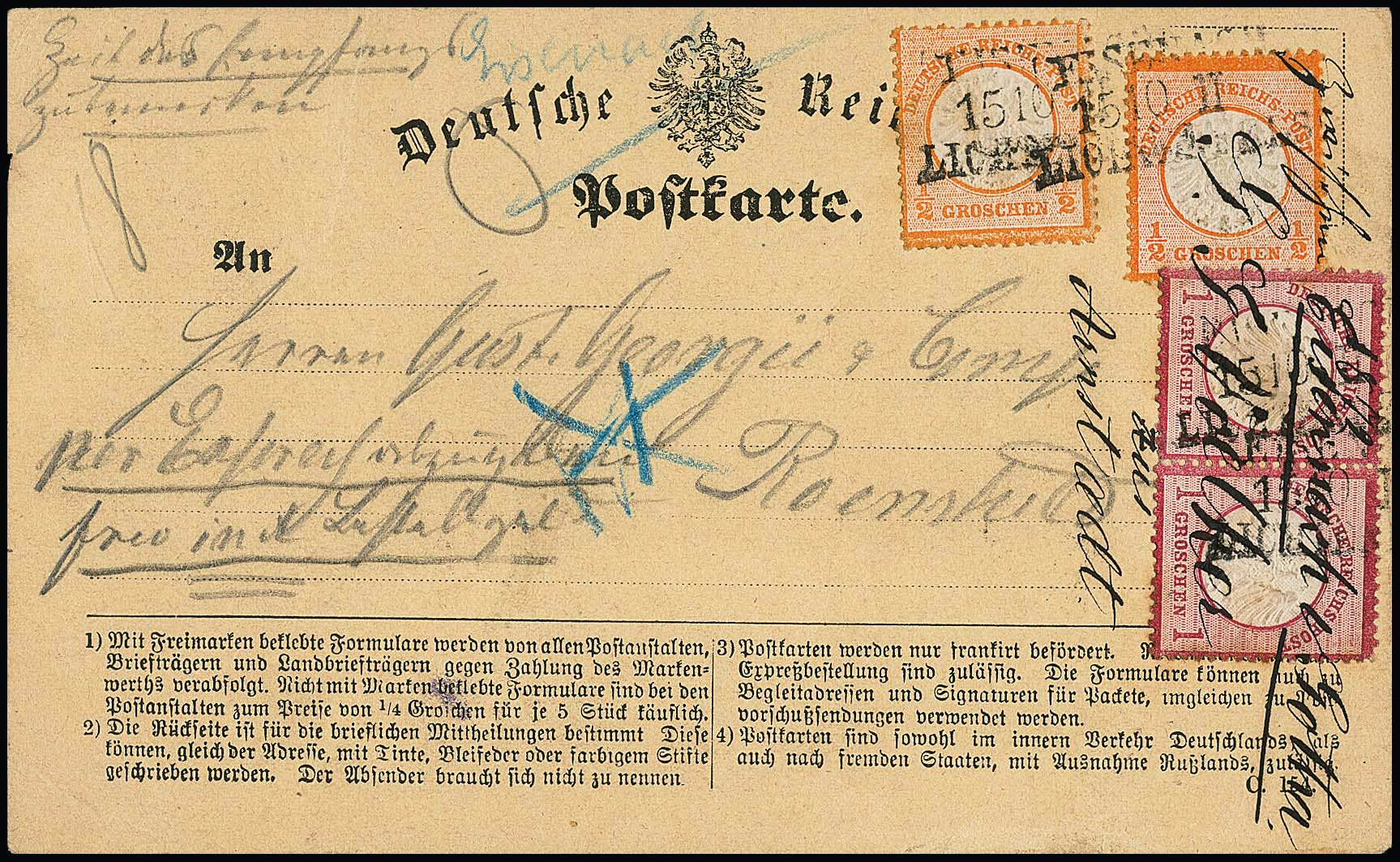1 Gr. rosa im Paar, nebst zweimal 1/2 Gr. orange, min. Zahnunebenheiten, auf Bahnpost-Expreßkarte, hs. "Eisenach", sowie Zug-L3 "Eisenach-Lichtenfels", nach Römhild, siehe Foto. Fotoexp. Brugger