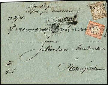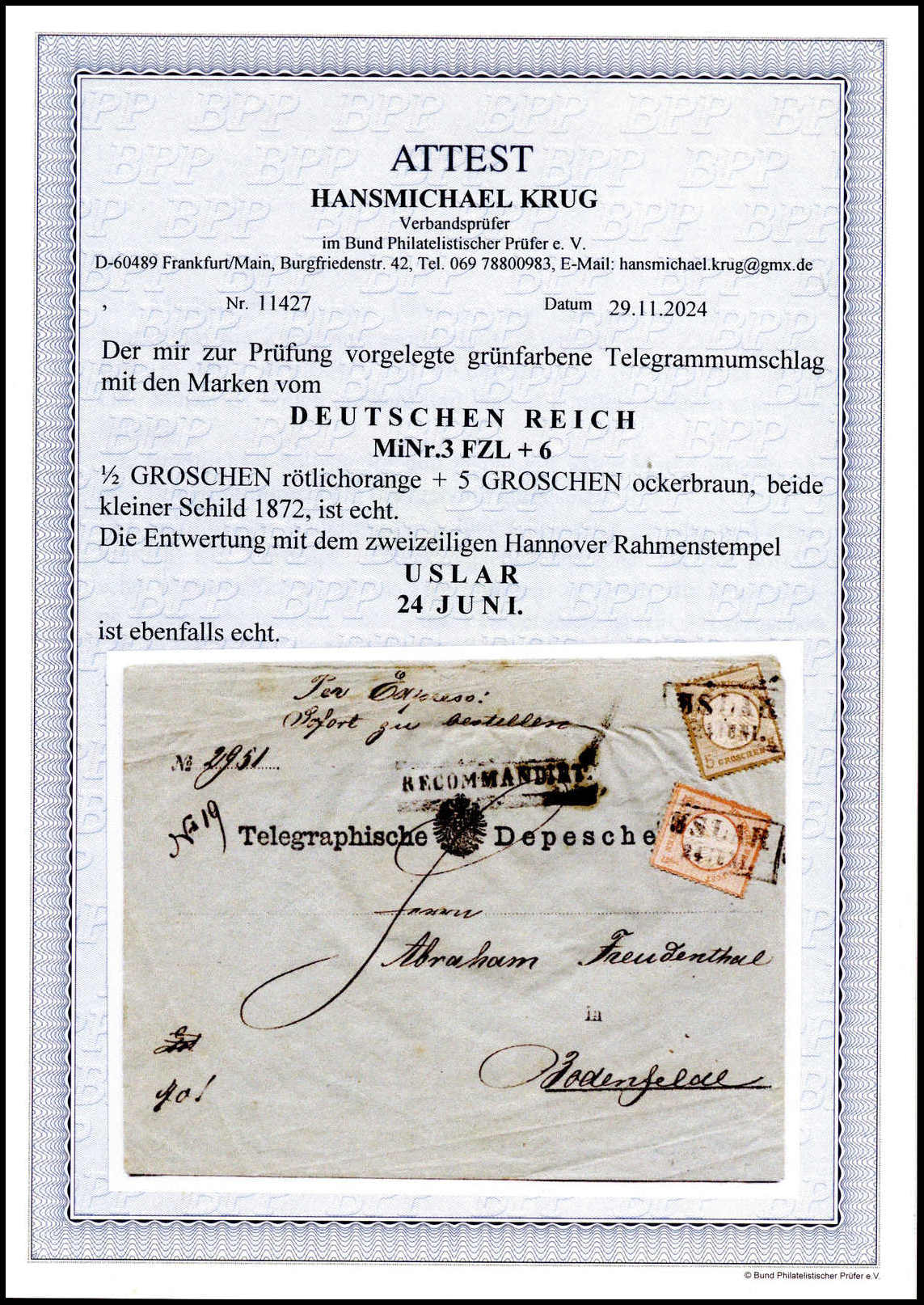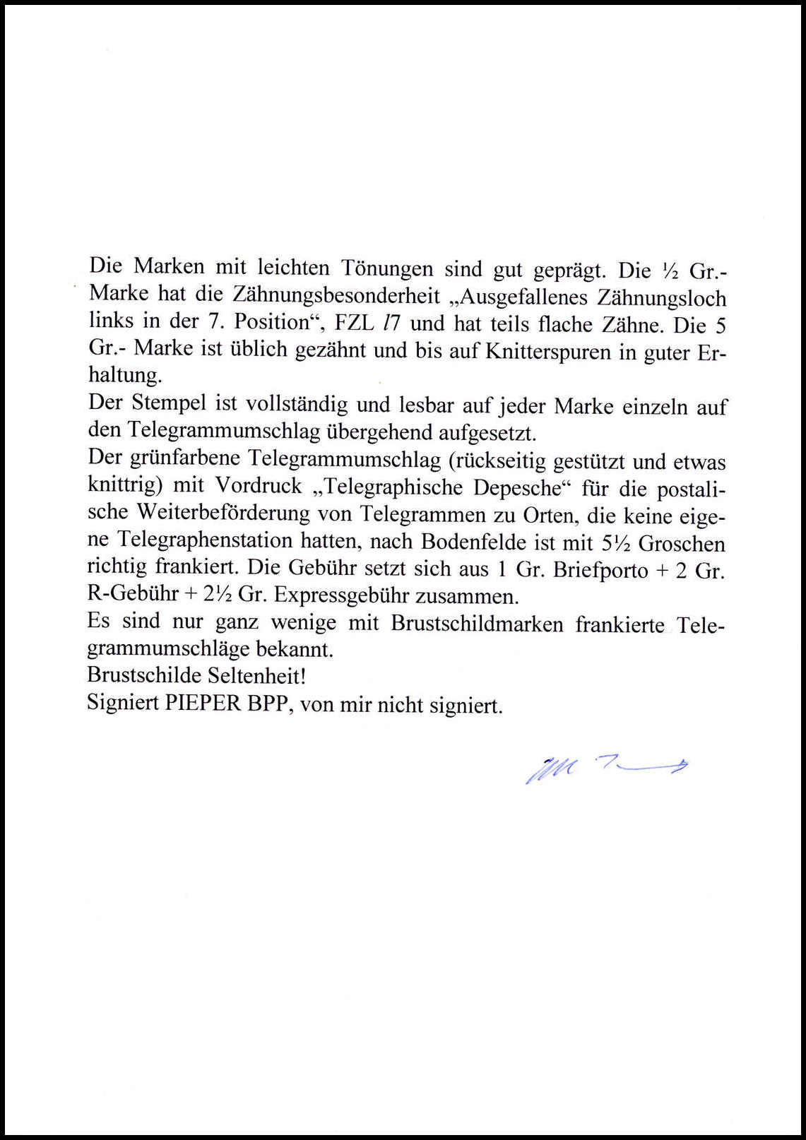 1/2 Gr. rotorange nebst 5 Gr. ockerbraun als portogerechte 5 1/2-Gr.-Frankatur auf grünem Vordruckumschlag "Telegraphische Depesche" und Vermerk "per Express, sofort zu bestellen", mit klaren Hannover-Ra2 "Uslar" nach Bodenfelde, Neben-Ra1 "Recommandirt", übliche leichte Unebenheiten. Frankierte Telegramme aus der Brustschildzeit sind postgeschichtliche Raritäten. Fotoattest Krug ("es sind nur ganz wenige mit Brustschildmarken frankierte Telegramm-Umschläge bekannt")