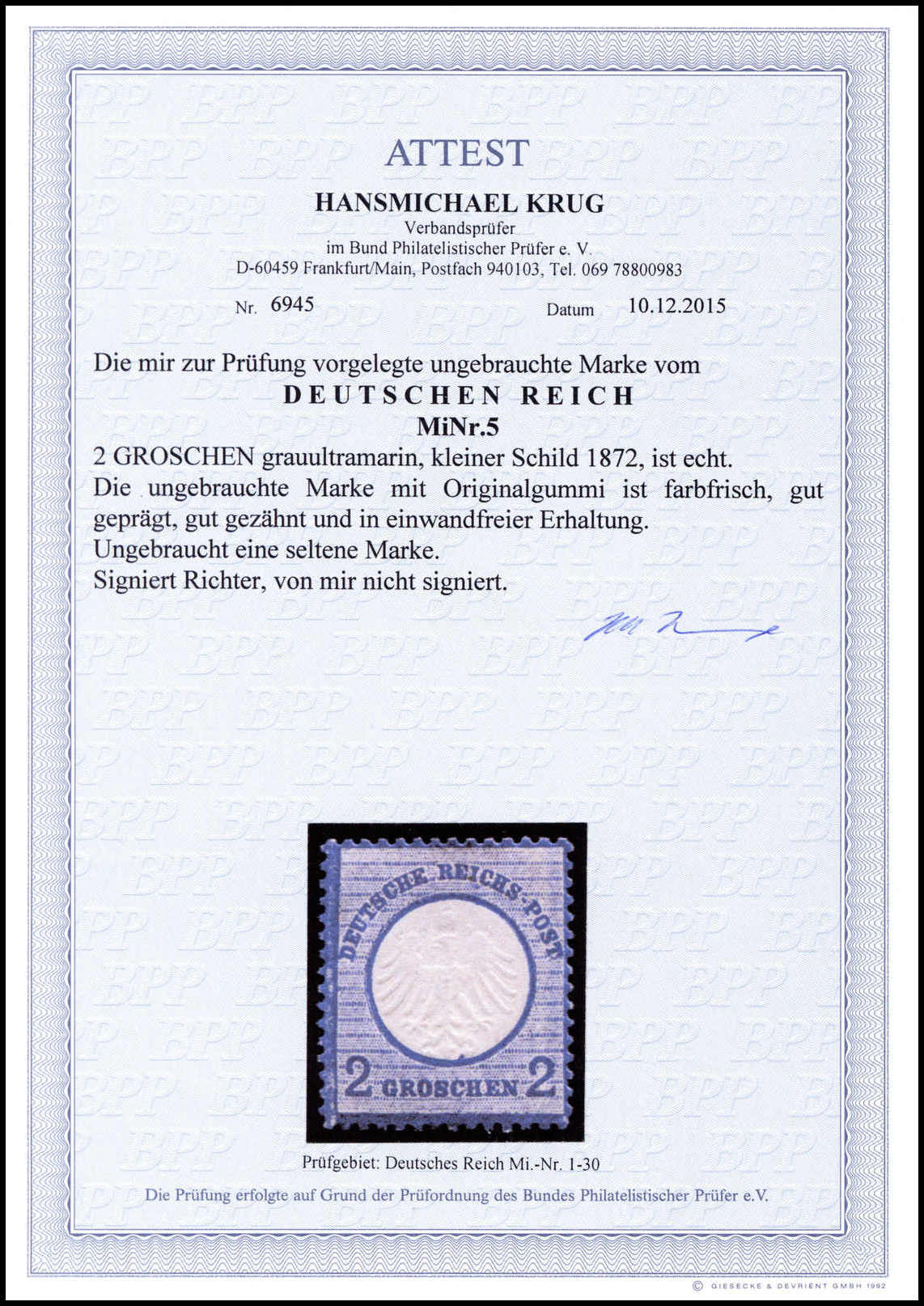 2 Gr. graublau, ungebrauchtes Luxusstück in perfekter Zähnung und tiefer Prägung. Vollständiger, nahezu postfrischer Originalgummi, Fotoattest Krug. Mi. 2200,- +