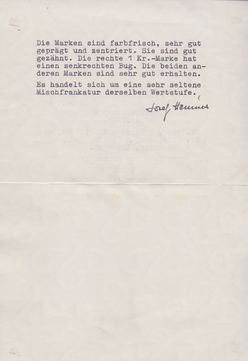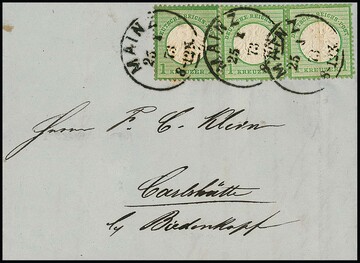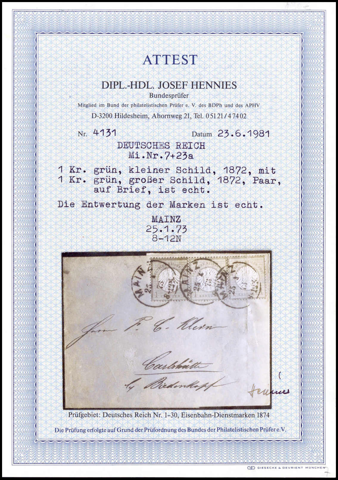 1 Kr. grün in wertgleicher Mischfrankatur mit waager. Paar 1 Kr. grün, gr. Schild (re. Marke Bugspur), als seltene Frankatur-Kombination auf Brief nach Carlshütte, klare K1 "Mainz 25/1 73", Fotoattest Hennies ("sehr seltene Mischfrankatur der selben Wertstufe")