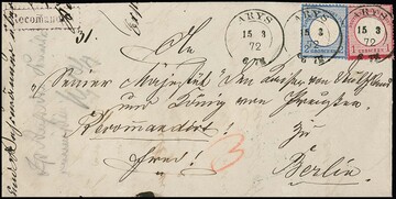 1 Gr. rosa (Eckzahn etwas locker) nebst Kabinettstück 2 Gr. ultramarin auf recommandiertem, rs. nicht vollständigem Brief, adressiert: "Seiner Majestät dem Kaiser von Deutschland und König von Preussen zu Berlin". Klare und zentr. abgeschlagene K2 "Arys 15/3 72", sowie nebengesetzt violetter Ra1 "Recommandirt", rs. blauer Ra3 "Berlin Cabinets-Expedition". Es sind nur wenige Briefe an den Deutschen Kaiser erhalten geblieben