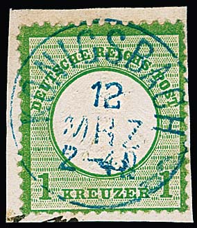 1 Kr. grün (versch. Nuancen), drei Orts-Einzelfrankaturen, auf Orts-Drucksache aus Mannheim (alter K2), sowie auf zwei Ortsbriefen aus Frankfurt (aptierter Franko-K1) und Mainz (Marke im kleineren Format), Mi. 720,-