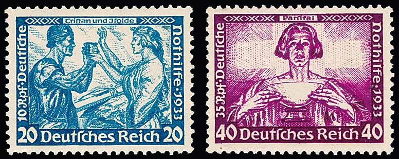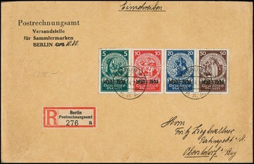 Wagner-Zusammendrucke 4/6/4 und 6/4/6 Pfg. jeweils als Kehrdrucke zusammenhängend, nebst 3 Pfg. Hindenburg, auf eingeschriebener Drucksache mit hierauf sehr seltenem Stempel "Bayreuth Festspielhügel" und entspr. R-Zettel, auch für den Musik-Thematik-Sammler eine Besonderheit!