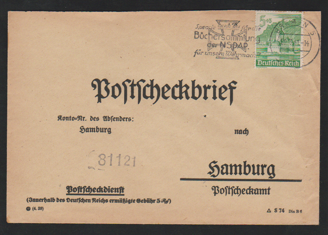 5 Pfg. (Hindenburg, Hindenburg-Trauer und WHW 1940), drei Einzelfrankaturen auf Postscheckbriefen