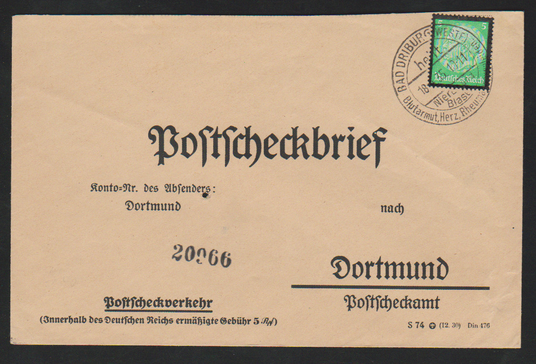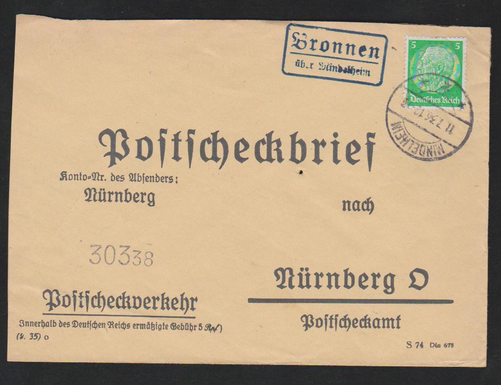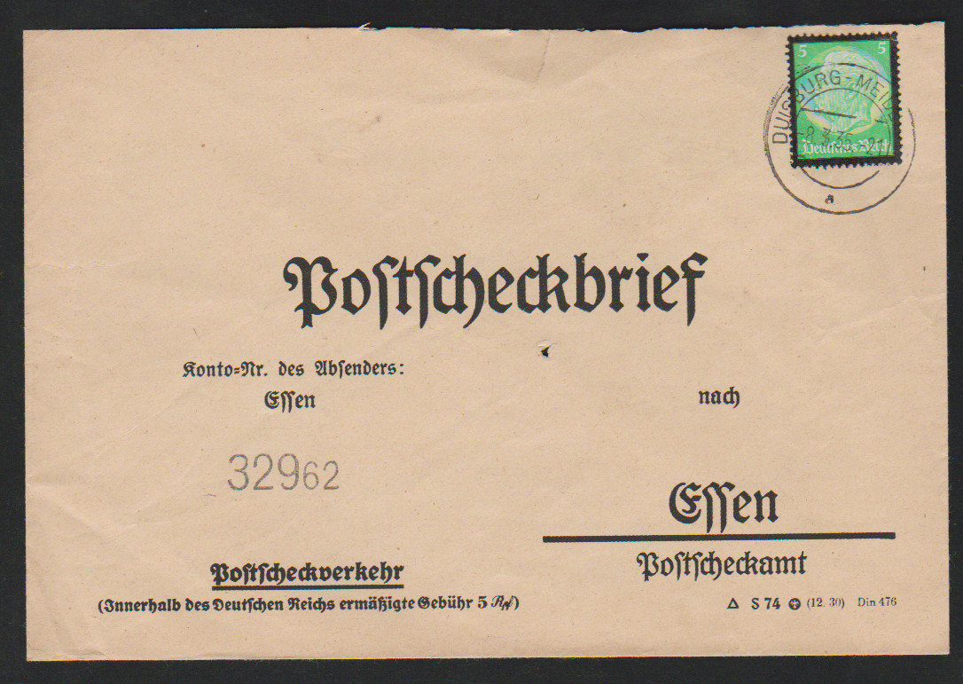 5 Pfg. (Hindenburg mit POL-Lochung, Couvert verkürzt, ferner Flugpost und Hindenburg-Trauer), drei Einzelfrankaturen auf Postscheckbriefen