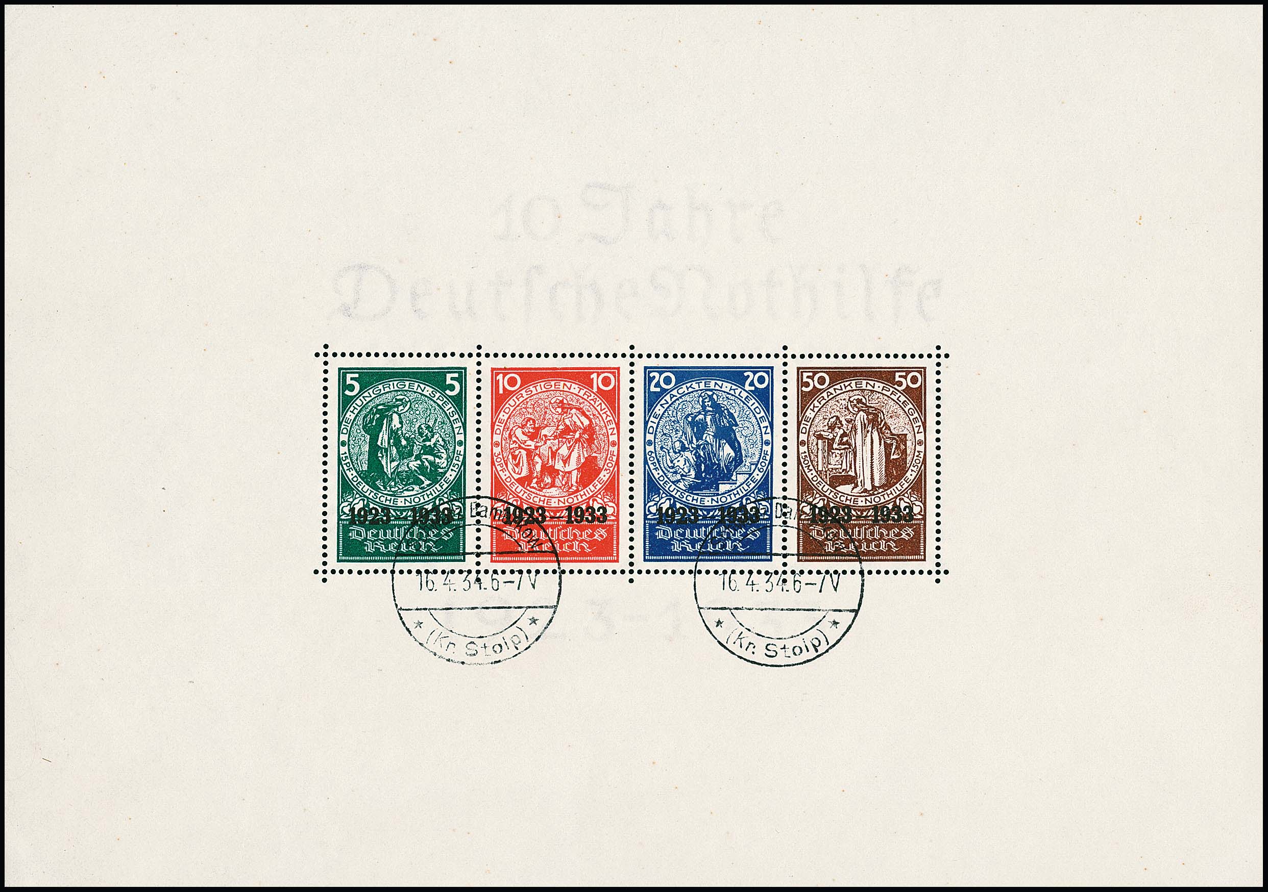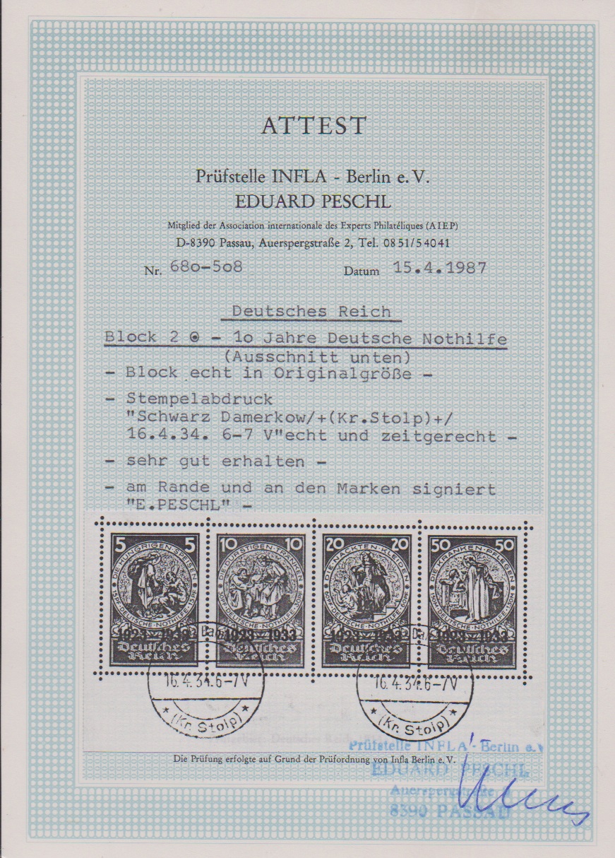 Nothilfe-Block mit klaren Stempeln von "Schwarz Damerkow (Kr. Stolp.)", verwendungsbedingte kleine Tintenpünktchen am Blockrand im fehlerfreien Attest Peschl nicht bemängelt. Mi. 10.000,-