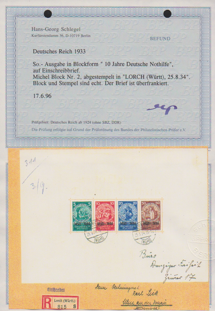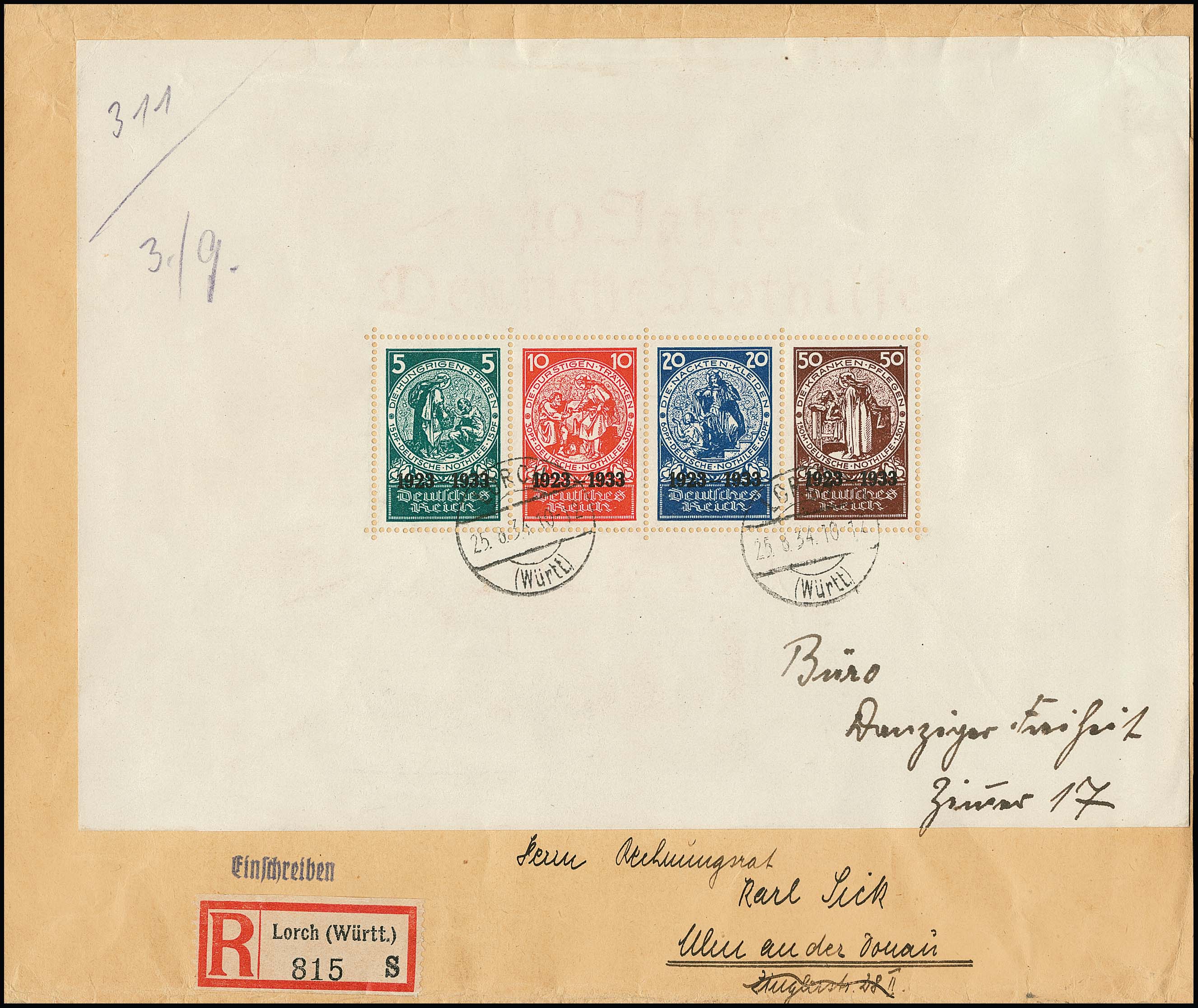 Nothilfe-Block auf gelaufenem Sieger-R-Brief aus Lorch nach Ulm mit den typischen Gebrauchsspuren der postalischen Beförderung, Fotoexp. Schlegel. Mi. lose 10.000,-