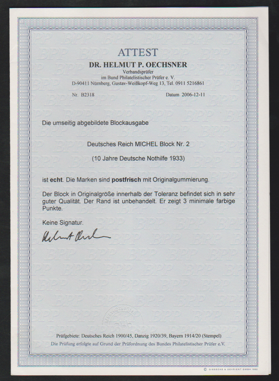 Nothilfe-Block postfrisch in sehr guter Erhaltung, im Rand drei winzige farbige Pünktchen, Attest Oechsner. Mi. 6000,-