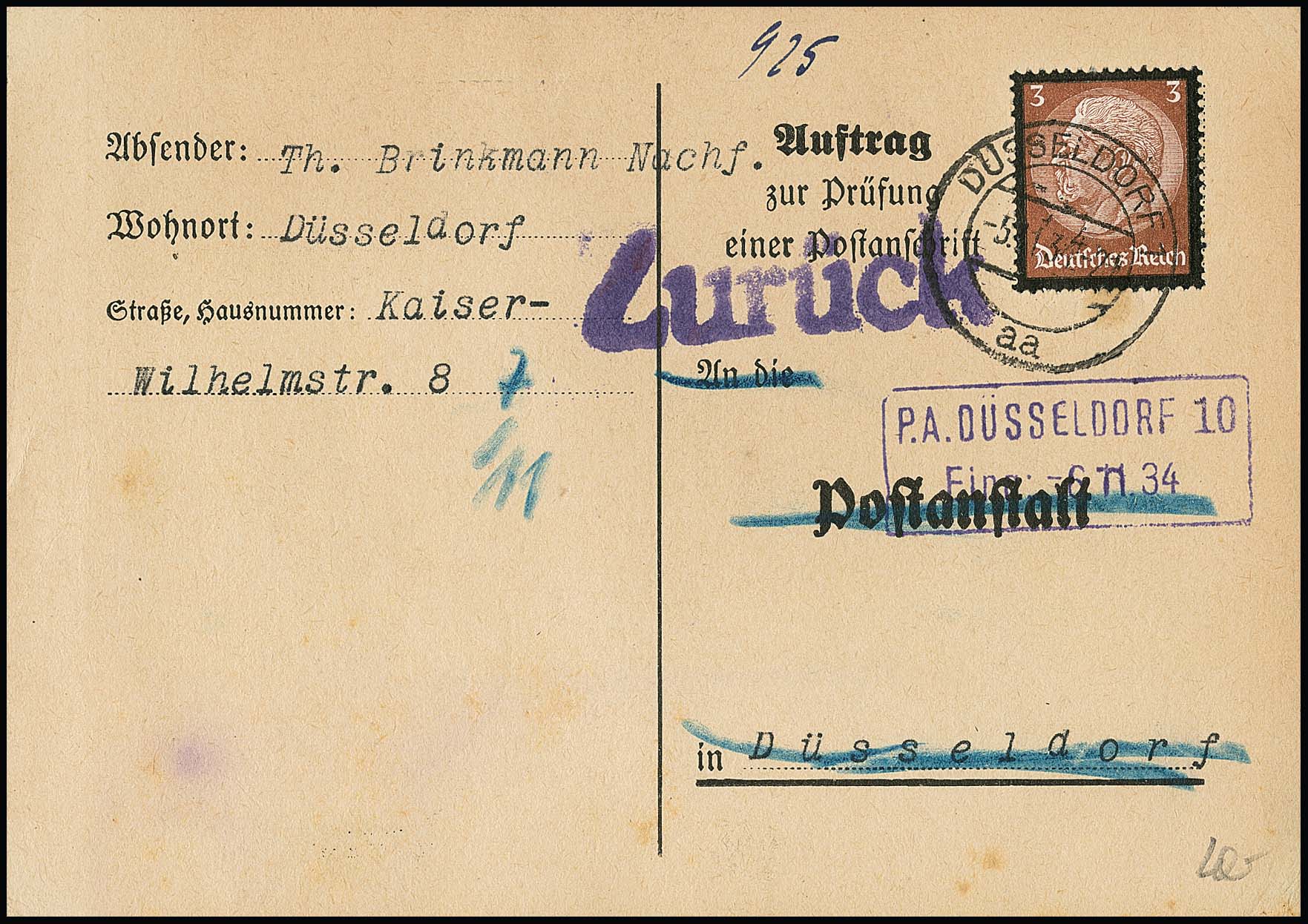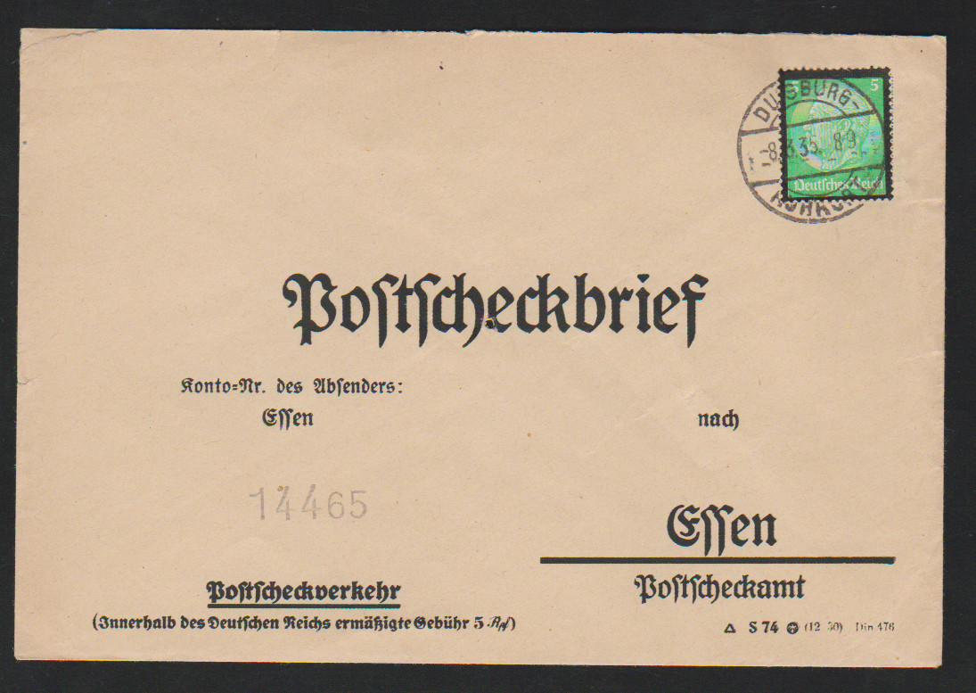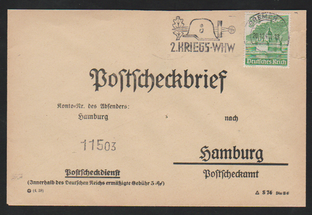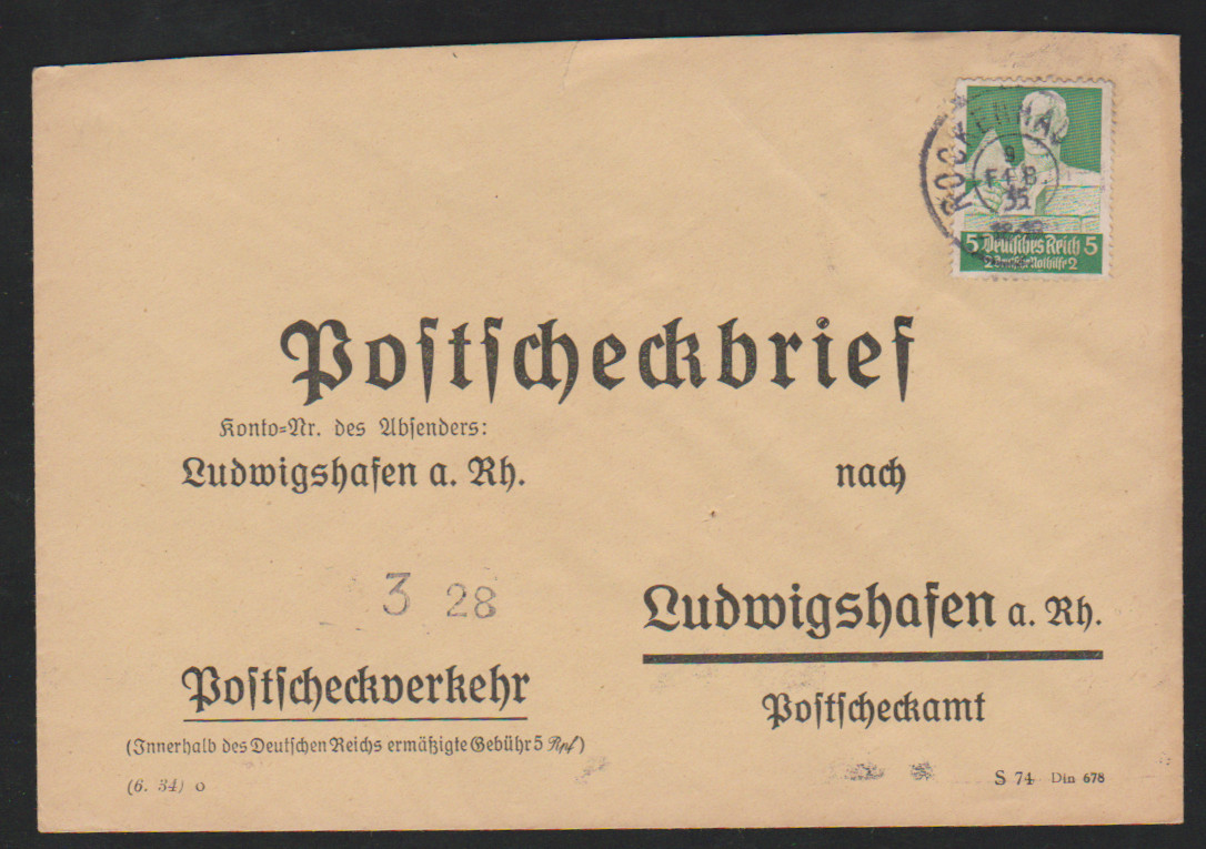 5 Pfg. (Hindenburg-Trauer, WHW 1934 und 1940), drei Einzelfrankaturen auf Postscheckbriefen