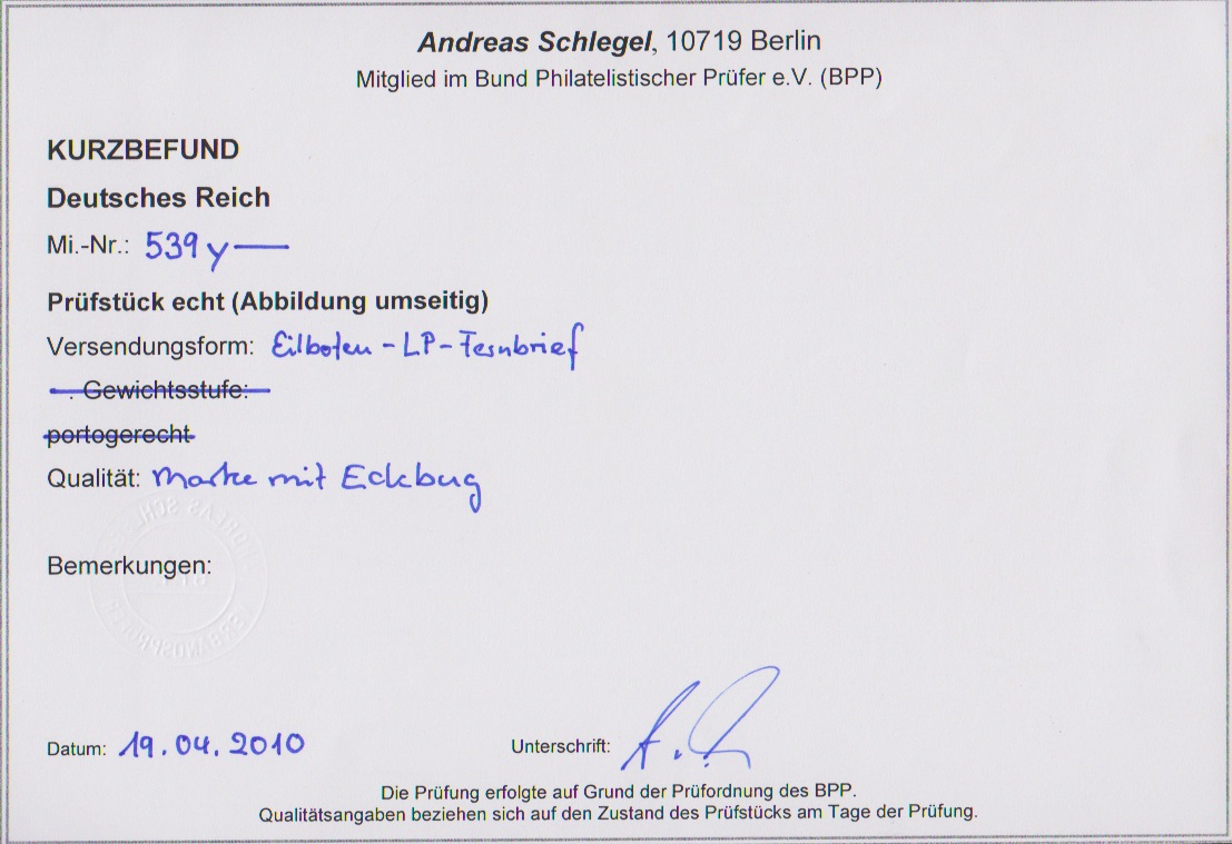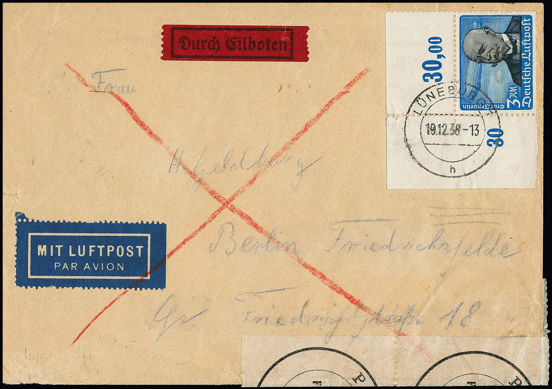 3 RM Flugpost, gute waagerechte Gummiriffelung (winziger Eckzahnbug), große linke obere Bogenecke auf amtlich verschlossenem Lupo-Expreßbrief von Lüneburg nach Berlin, Fotoexp. Schlegel. Mi. lose 600,-