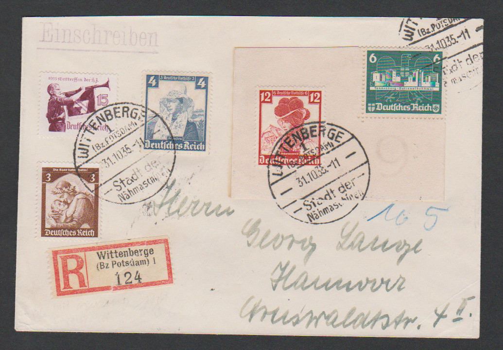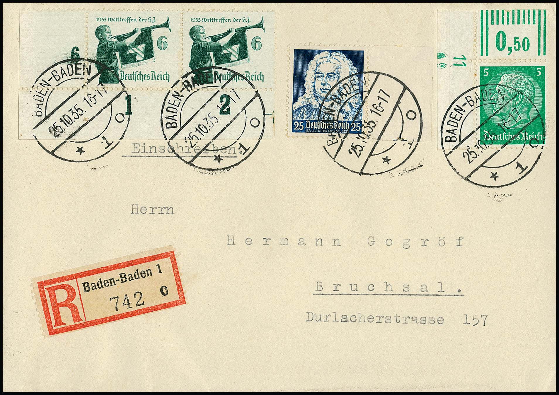 25 Pfg. Händel, Plattenfehler "1585" (Mi. 120,-), nebst linker oberer Bogenecke 5 Pfg. Hindenburg mit DZ "1", sowie Eckrandpaar 6 Pfg. HJ, auf R-Brief