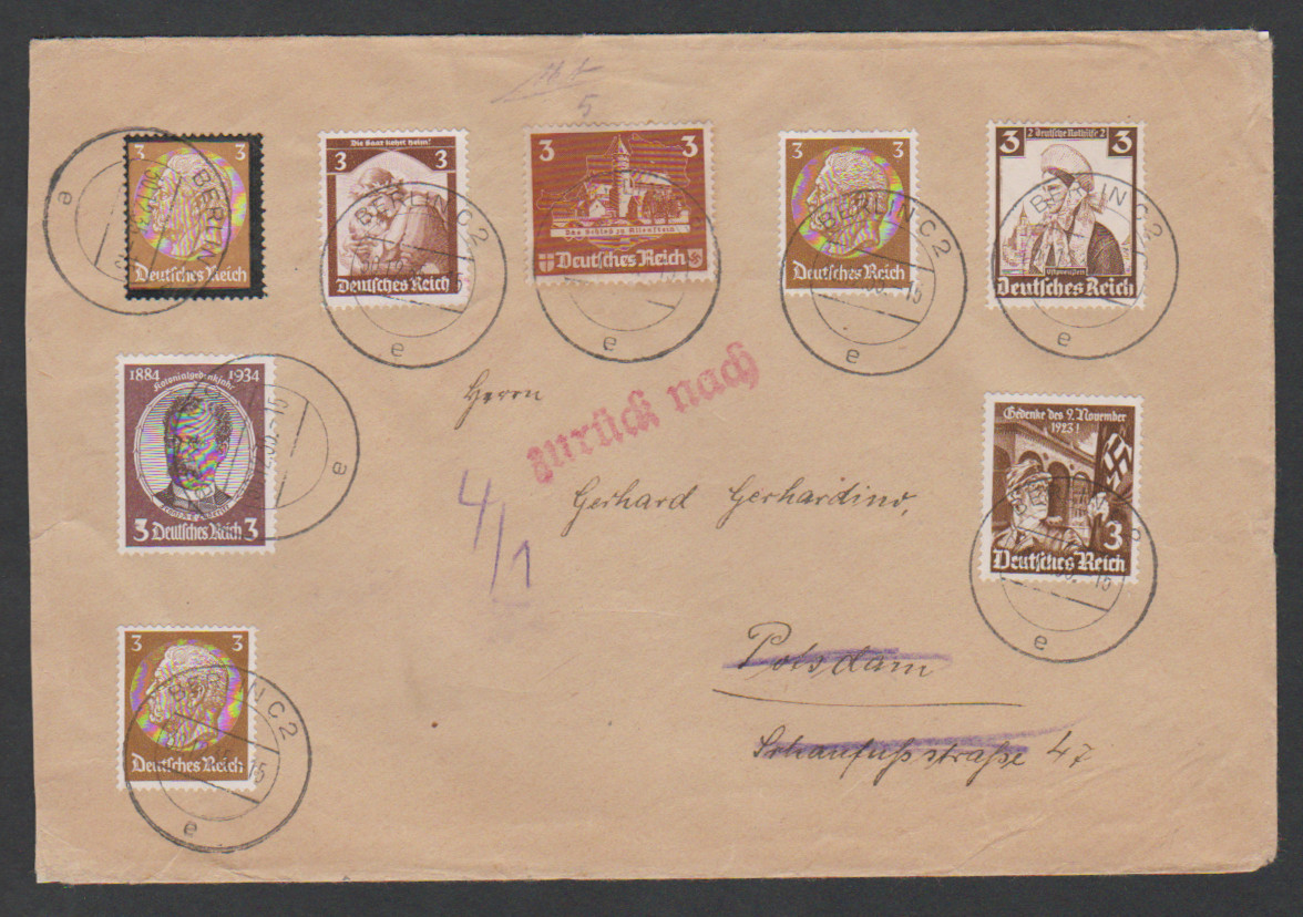 3 Pfg. aus Ostropa-Block (mit sieben versch. anderen "Braun-Werten"), bzw. 6 Pfg. als Block-Ecke, je in MiF auf zwei Briefen