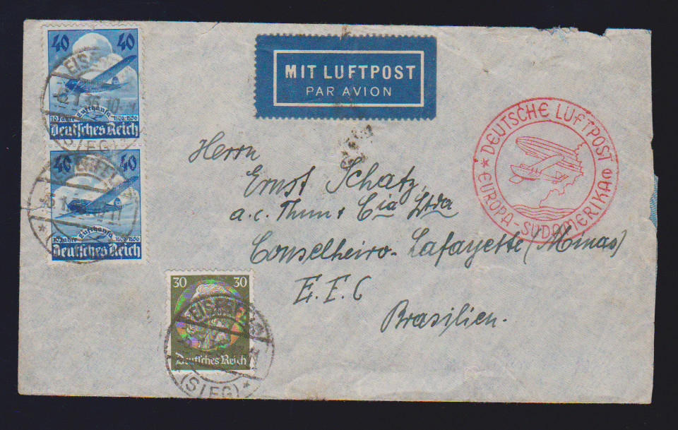 40 Pfg. Lufthansa im Paar nebst 30 Pfg. Hindenburg auf Bedarfs-FDC (kl. Gebrauchsmgl.), Mi. 600,-