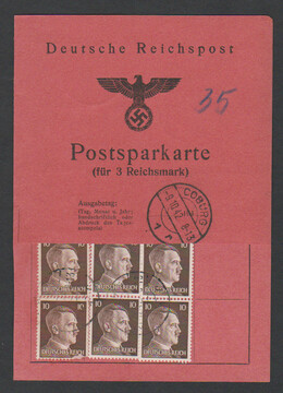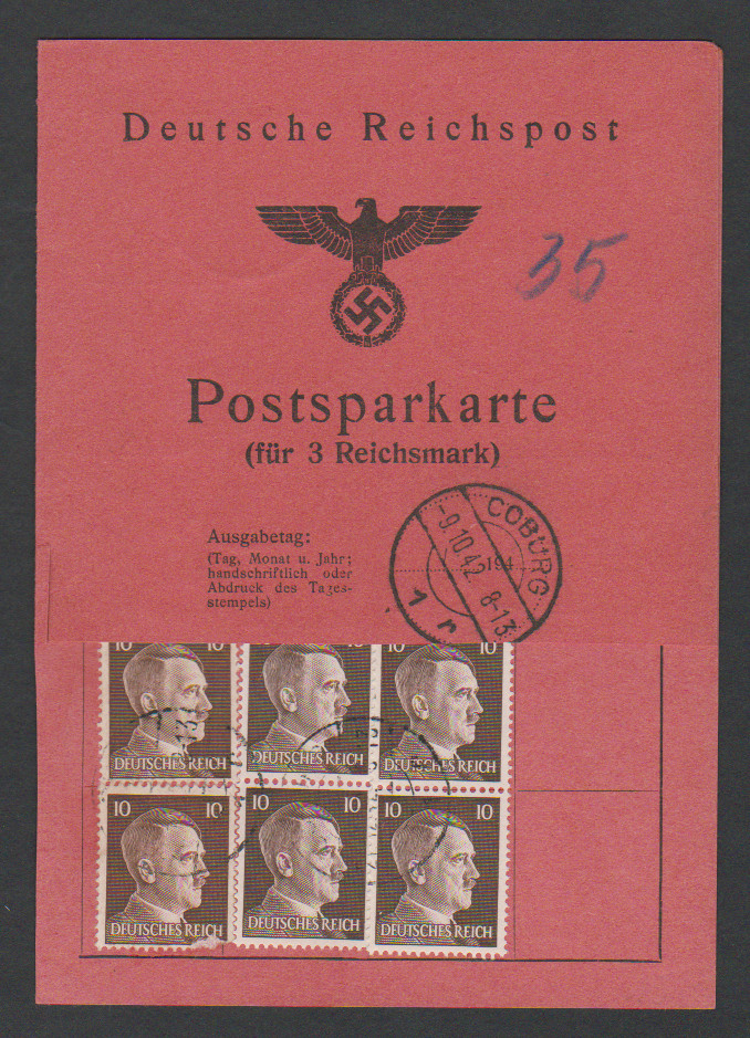 10 Pfg. Hitler per 30 (einmal kl. Mgl.) auf Postsparkarte aus Coburg 1942