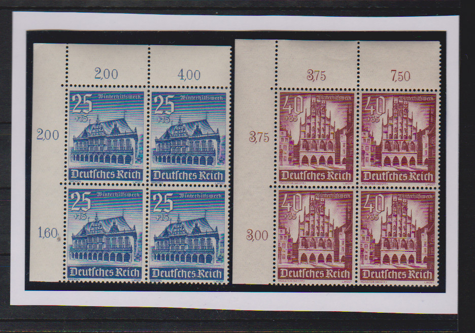 WHW Bauwerke einheitlich in postfrischen Viererblöcken aus der linken oberen Bogenecke, Mi. 160,- ++