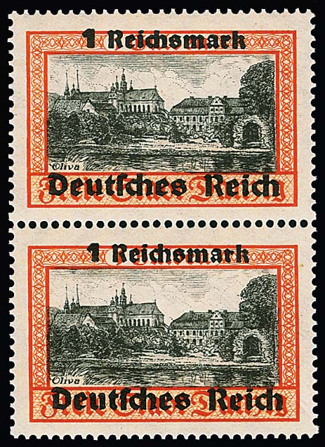 1 RM Danzig-Abschied, senkrechtes postfrisches Paar, obere Marke Plattenfehler "doppeltes i von Oliva", sign. Schlegel. Mi. 555,- +