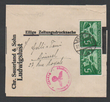 Zeitungsmarke 5 Pfg. im Paar auf Zensur-Auslands-Vordruck-Streifband (kleine Randrißchen) von Berlin 1941 nach Brüssel