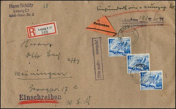 25 Pfg. Leipziger Frühjahrsmesse per drei auf R-NN-Doppelbrief von Leipzig 1941 nach Meiningen