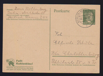 Propaganda-Ganzsachenkarte 6 Pfg. Hitler ("Faßt Kohlenklau!) als sehr saubere Ortskarte aus Berlin 1943