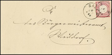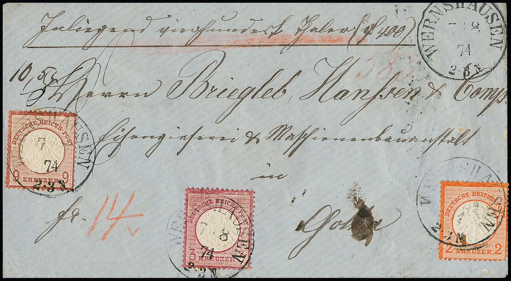 2 Kr. ziegelrot in Mischfrankatur mit 3 Kr. rosa und 9 Kr. rotbraun auf Wertcouvert mit K1 "Wernshausen", trotz kleiner Unebenheiten seltene Kombination