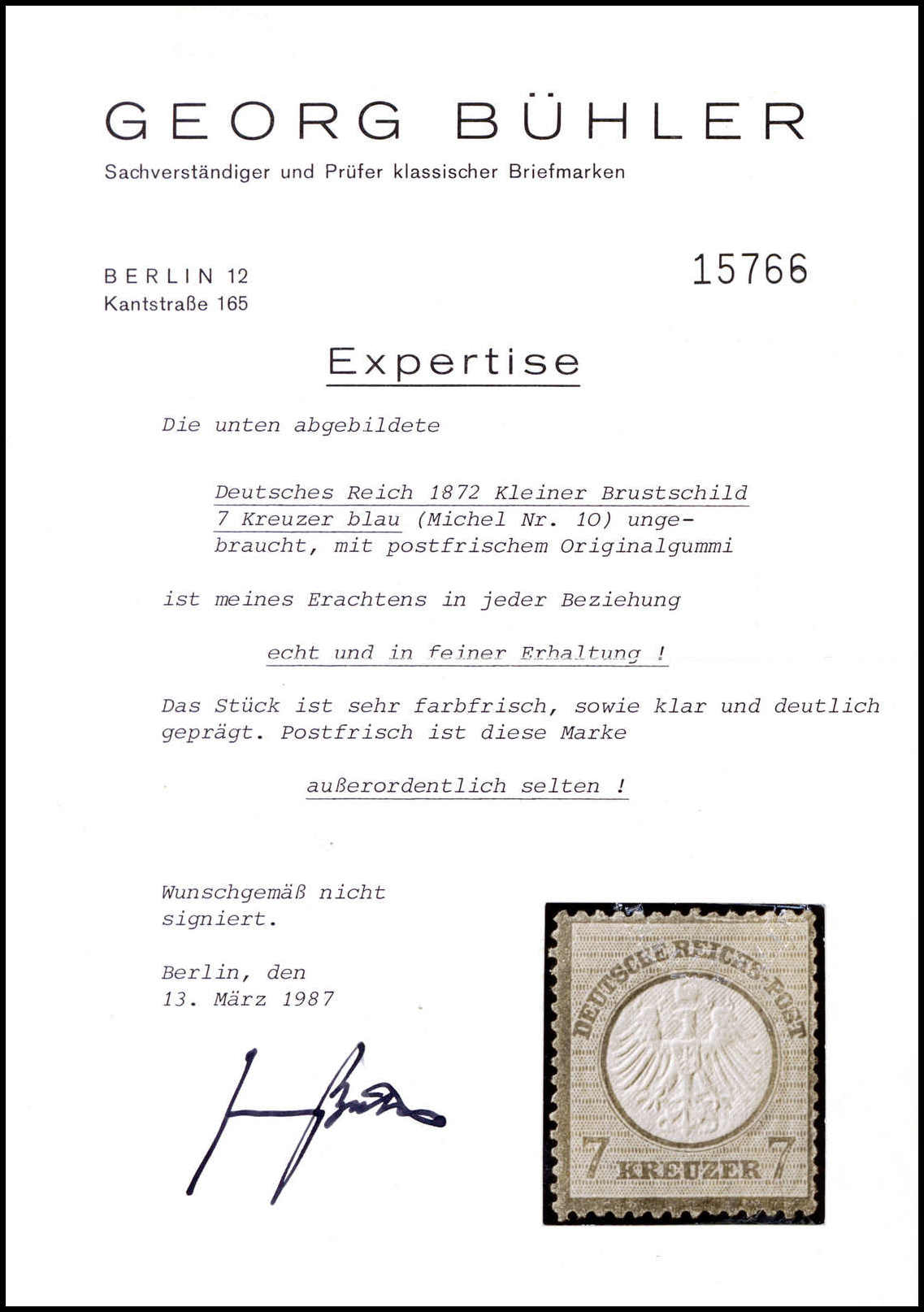 7 Kr. blau, ungebrauchtes Luxusstück mit vollständigem, praktisch unberührtem Originalgummi (einige Zahnspitzen winz. gummifrei). In dieser aussergewöhnlichen Qualität eine sehr seltene Marke, sign. Richter, Fotoattest Bühler (für postfrisch), sowie Fotoattest Jäschke-L. Mi. 3200,- +