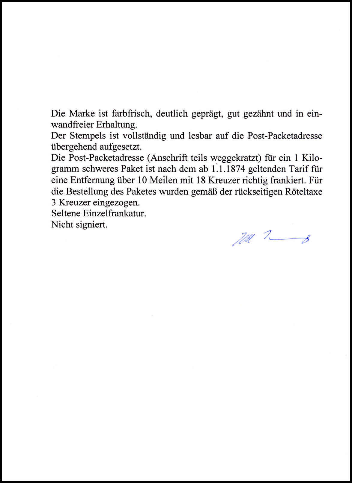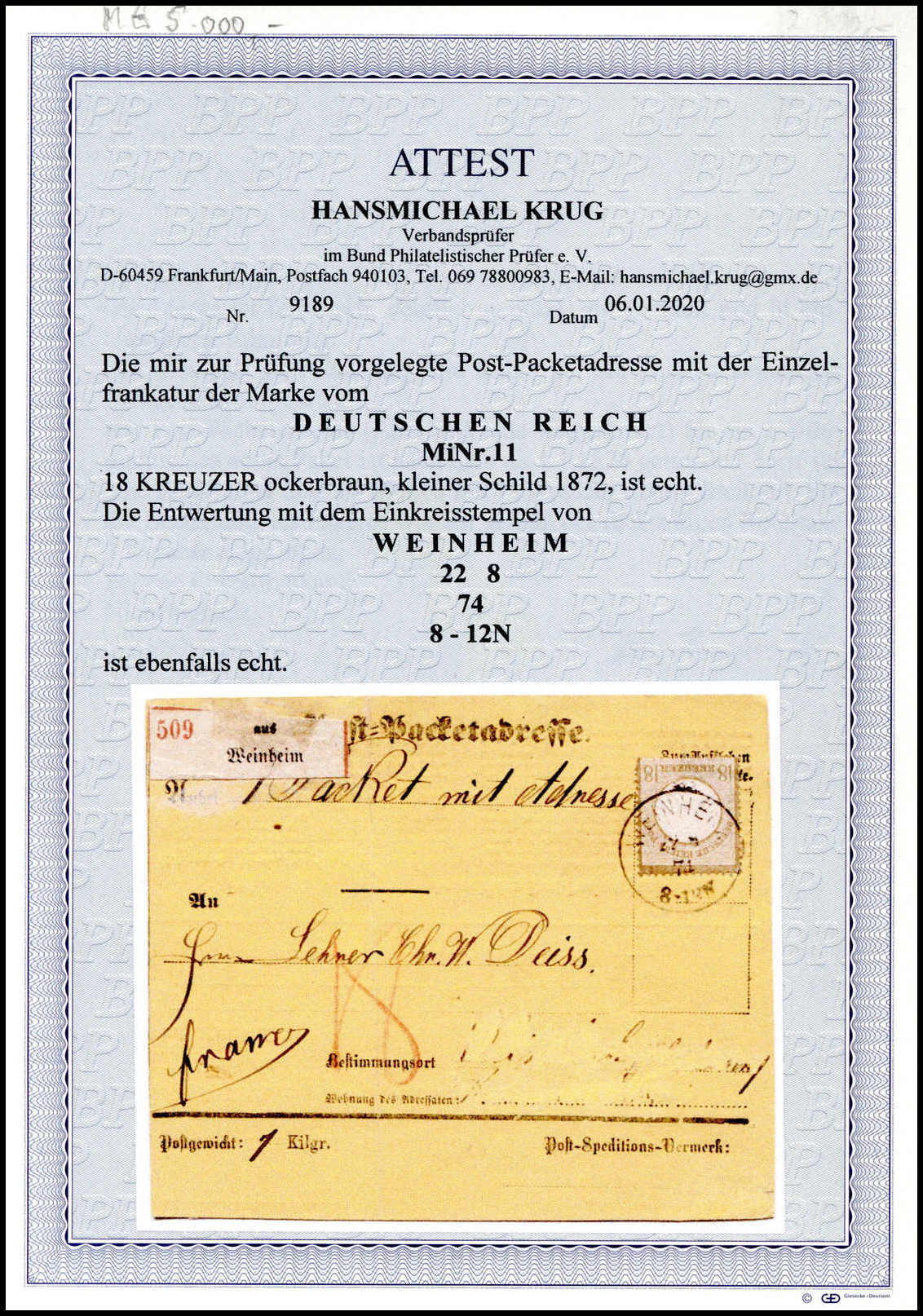 18 Kr. ockerbraun, Kabinettstück mit klarem K1 "Weinheim 22/8 74" auf gef. gelber Paketkarte (Bestimmungsort radiert). Eine seltene Einzelfrankatur, Fotoattest Krug. Mi. 5000,-