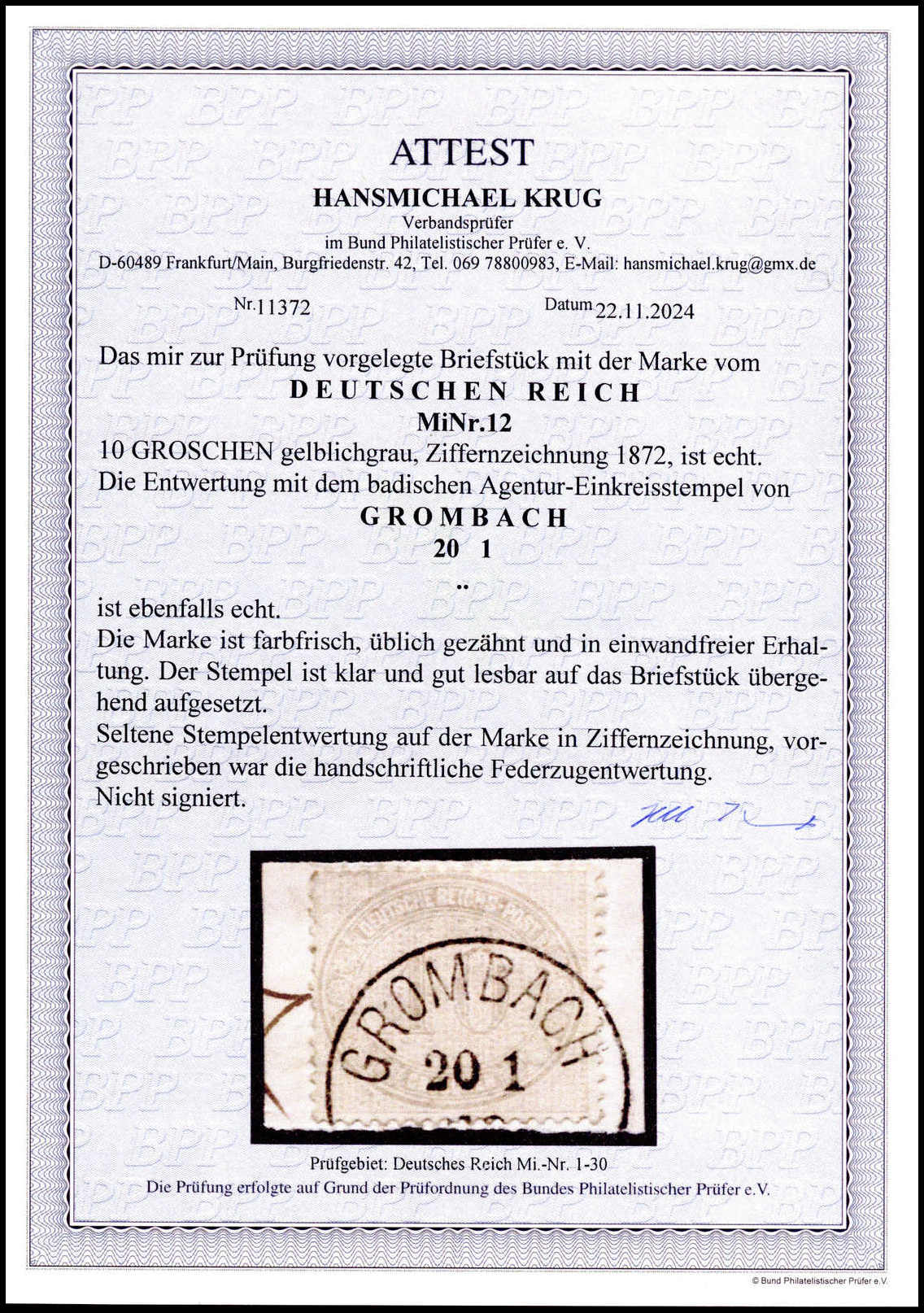 10 Gr. grau auf Prachtbriefstück mit klarem K1 "Grombach", eine seltene Marke mit alleiniger Poststempel-Entwertung, Fotoatteste Sommer, Krug ("in einwandfreier Erhaltung"). Mi. 1700,- +