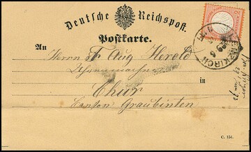 2 Kr. ziegelrot, gut gezähntes Prachtstück auf seltener Postkarte (Formular typische Faltspuren und unten leicht fleckig) von Lenzkirch nach Chur/Schweiz, interessante Kuriosität, da, obwohl unterfrankiert, ohne Nachtaxe in das Ausland gelaufen und in dieser Form auch selten