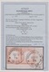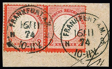 2 Kr. dunkelziegelrot, von dieser Marke seltenes, aussergewöhnlich farbtiefes Paar (linke Marke ein kürzerer Zahn) auf Prachtbriefstück mit klaren K1 "Frankfurt a.M. N. 3", sign. Pfenninger und Attest Krug. Mi. 1200,-