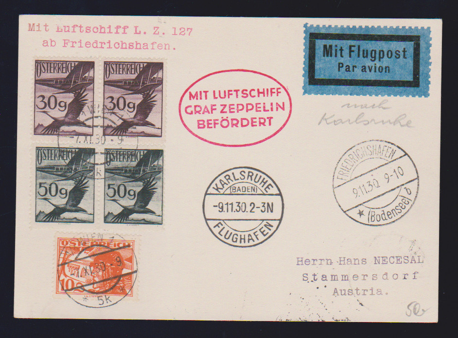 Landungsfahrt nach Karlsruhe 1930, drei Karten, Bordpost bzw. Karlsruhe-Friedrichshafen, sowie Karte Zuleitungspost Österreich