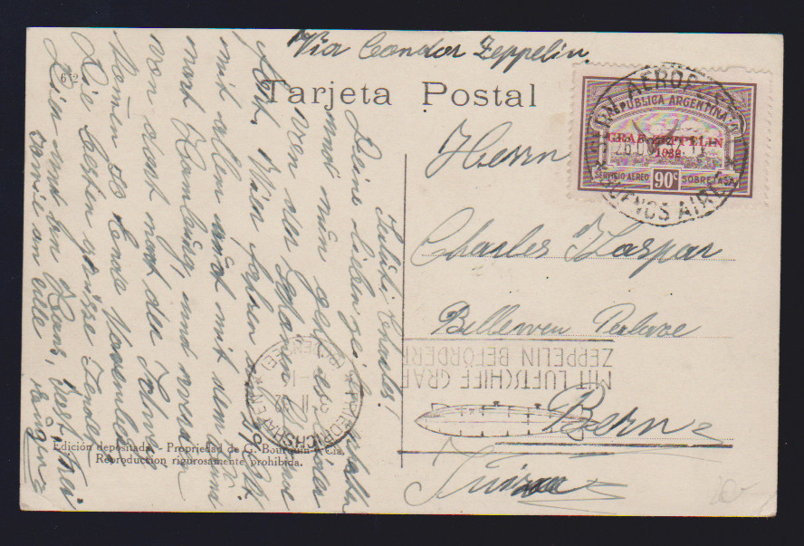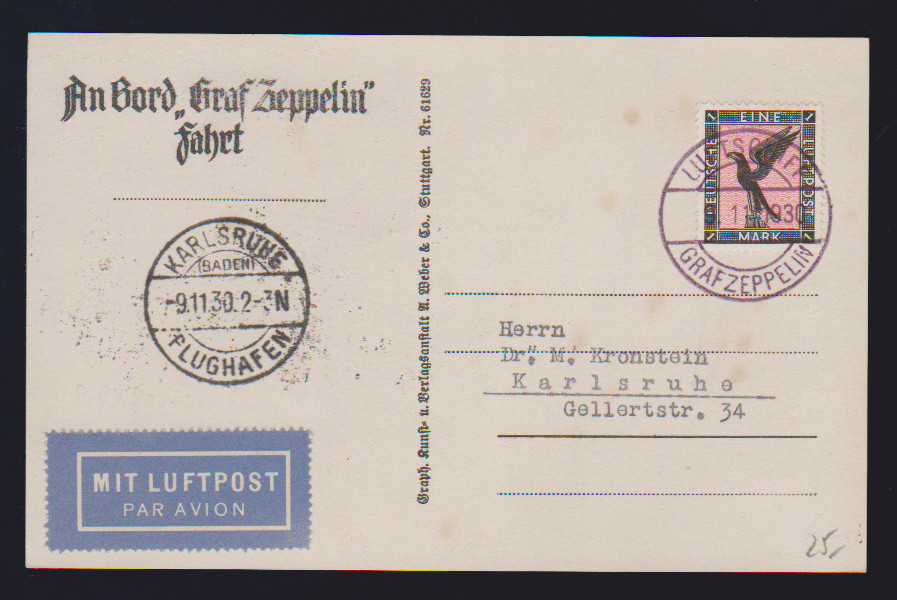 Zürichfahrt 1931, Bordpostkarte mit 1 RM Zeppelin (kl. Mgl.), Abwurf Zürich