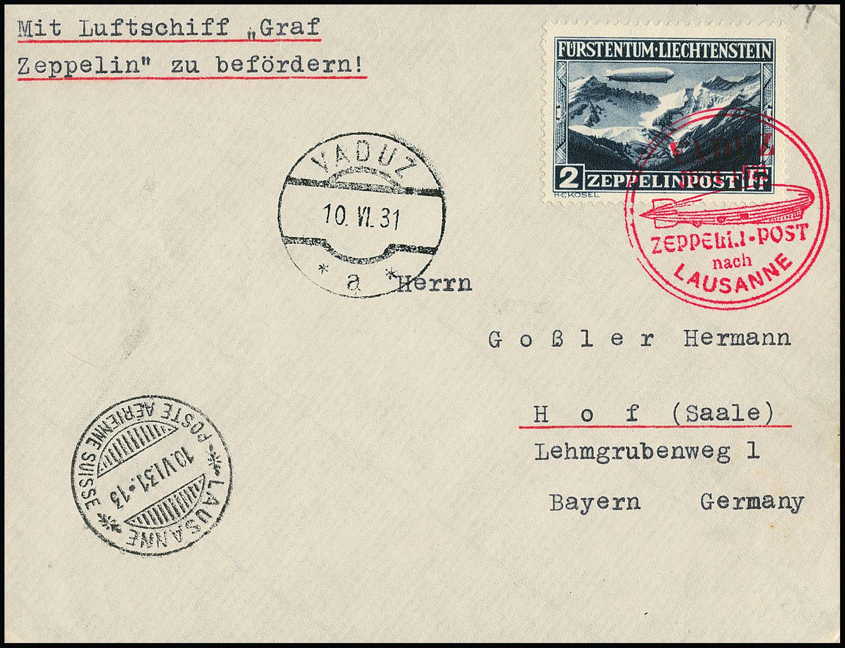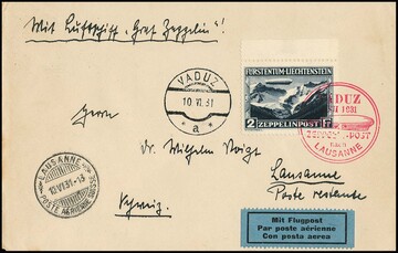 Fahrt Vaduz-Lausanne 1931, Brief mit Liechtenstein 2 Fr. Zeppelin vom Oberrand ab Vaduz (Mi. 500,-/Sieger 425,-)