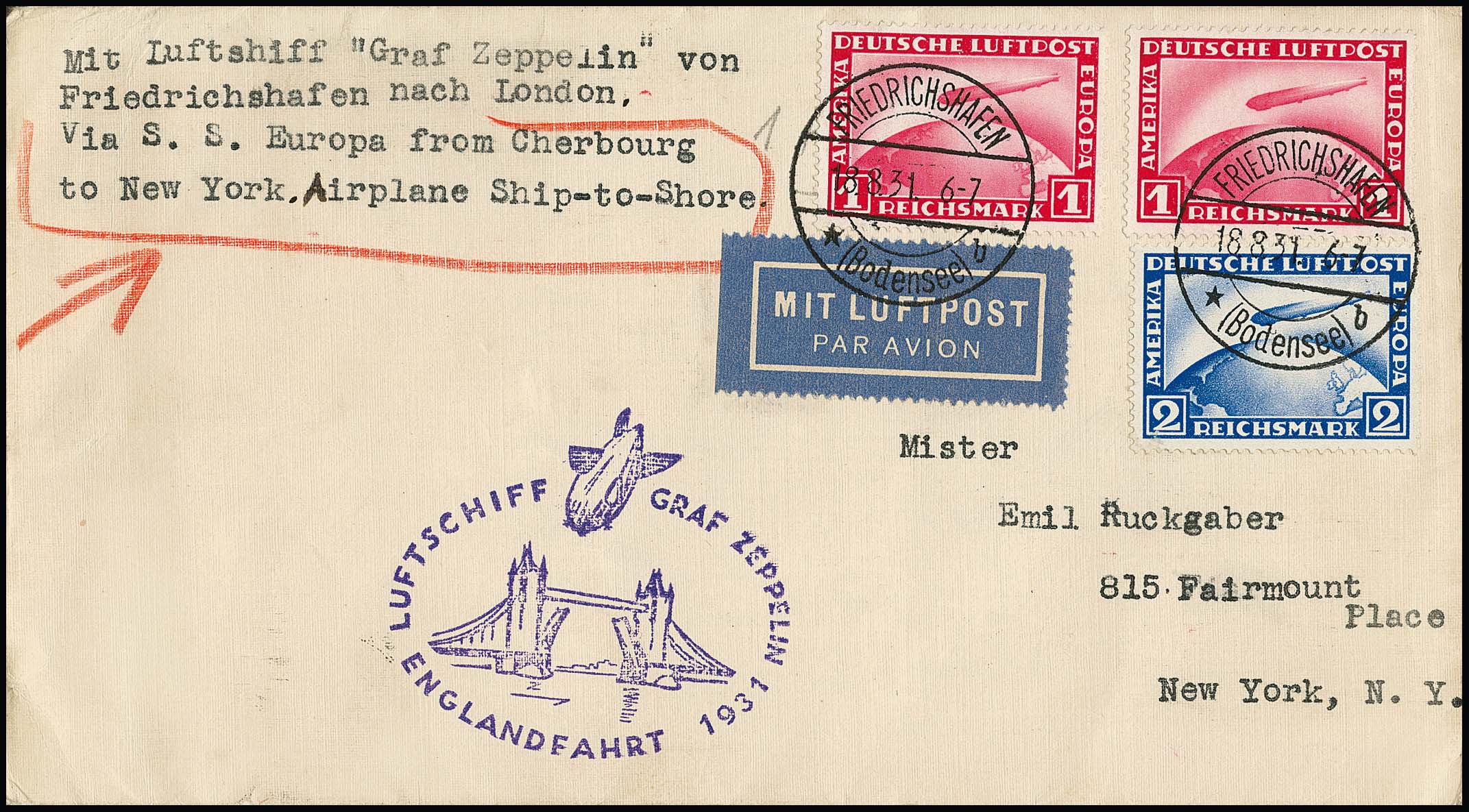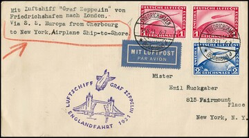 Englandfahrt 1931, Brief Auflieferung Friedrichshafen mit 1(2) und 2 RM Zeppelin nach New York