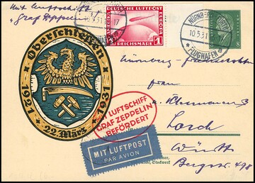 Fahrt nach Nürnberg 1931, sowohl Bordpostkarte als auch Karte ab Nürnberg-Fürth je mit 1 RM Zeppelin, ferner Bordpostkarte nach Nürnberg, Sieger 860,-