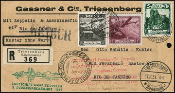 Fahrt Vaduz-Lausanne 1931, Liechtensteinische Post, Karte mit 1 Fr. Zeppelin, sowie Brief mit 2 Fr. Zeppelin