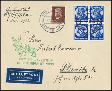 Deutschlandfahrt 1933, Bordpostbrief (zweiseitig geöffnet) mit u.a. Viererblock 25 Pfg. Fridericus