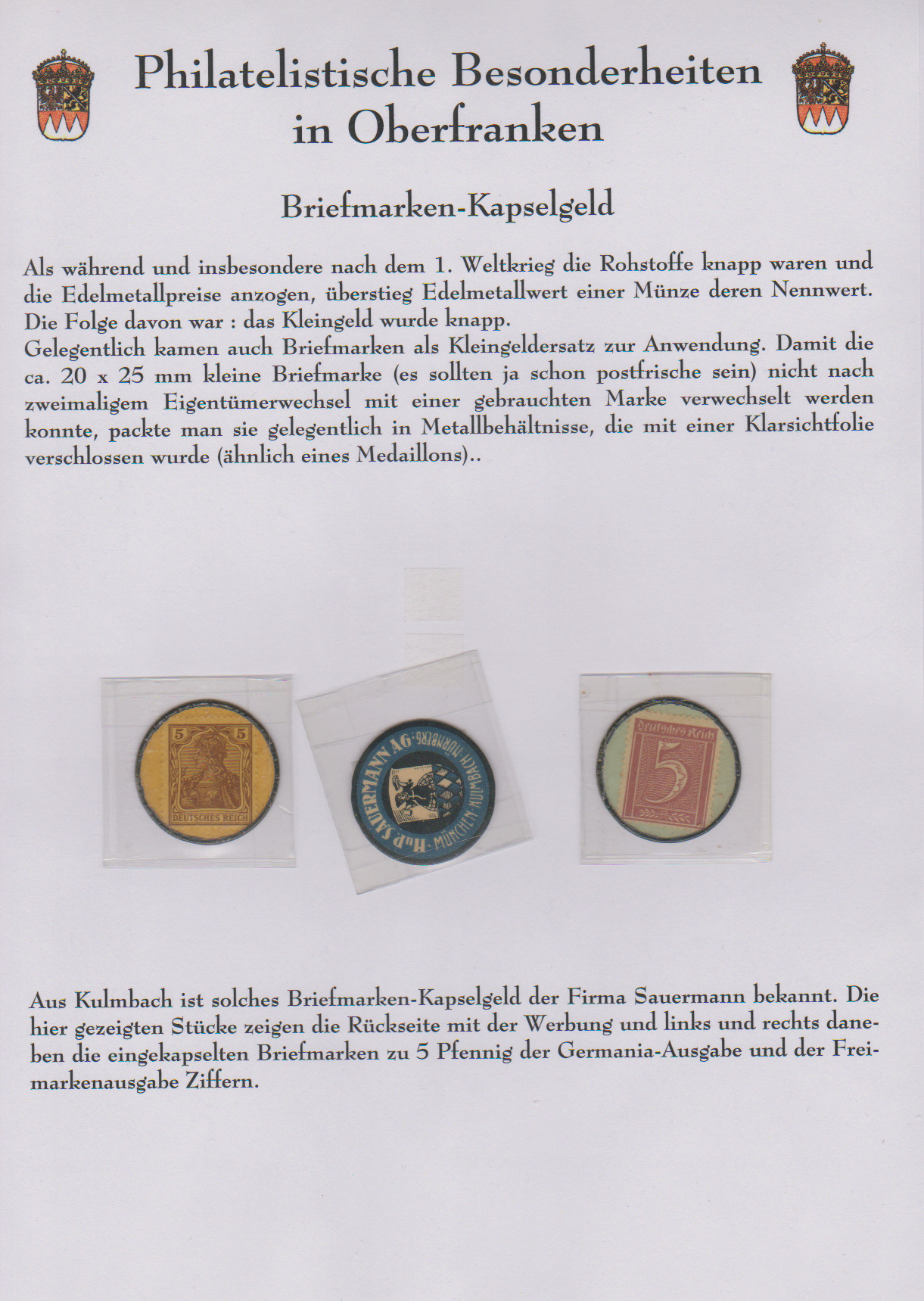 Kapselgeld, Kulmbach, 1922/23, drei Exemplare mit rs. Werbung der Fa. Sauermann, mit 5 Pfg. Germania bzw. Infla