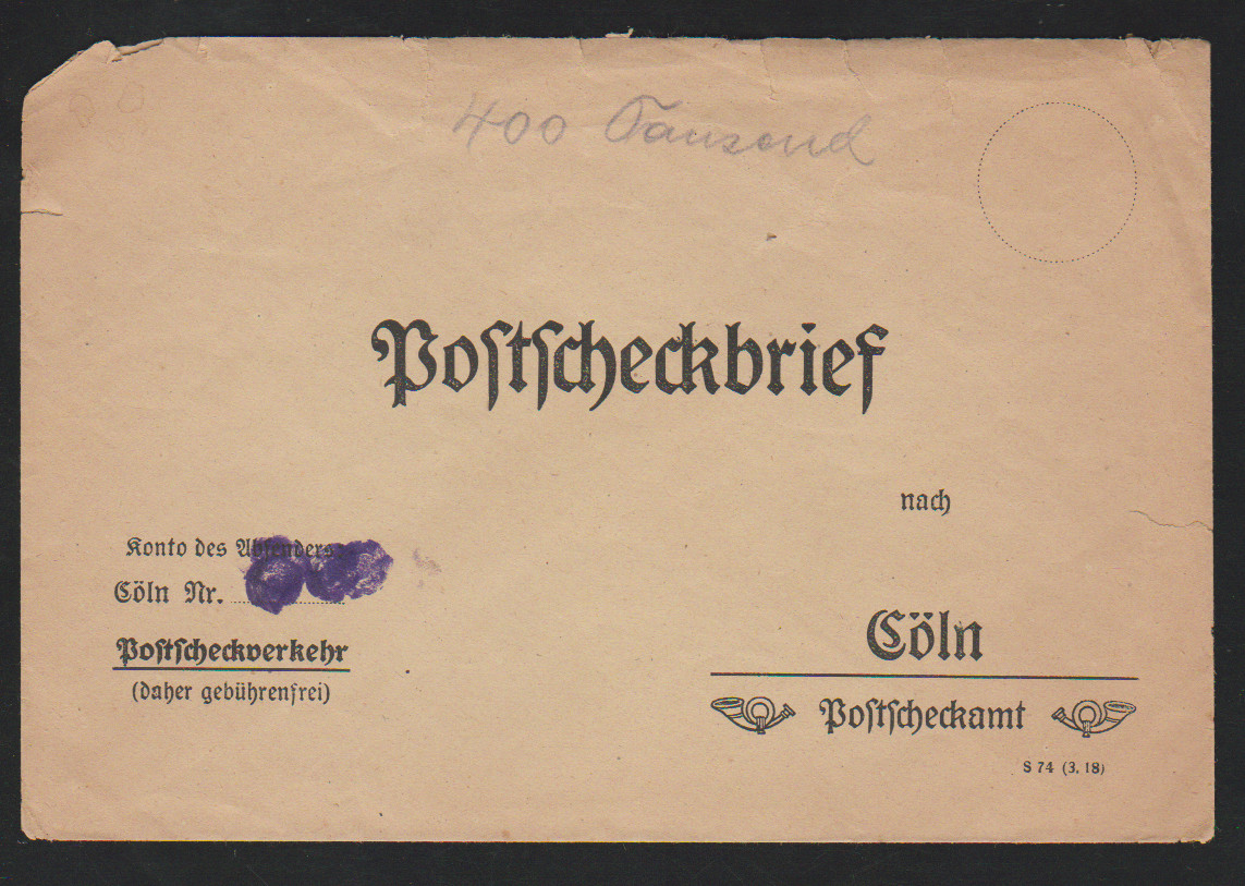 Postscheckdienst, (1923), frühes Vordruckcouvert des Postscheckamtes Cöln (übliche Gebrauchserhaltung mit kleinen Randmängeln) gelaufen mit hs. Gebührenvermerk "400 Tausend"