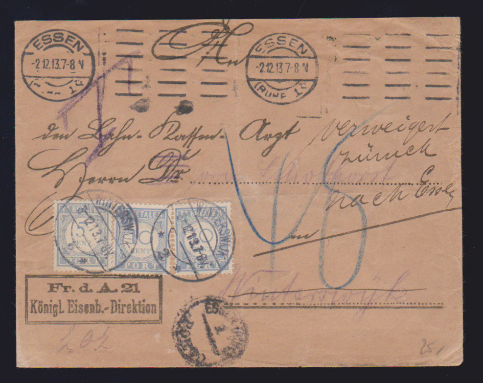 Portofreiheiten, drei bessere Belege, u.a. Eisenbahn-Dienstsache 1913 nach Holland mit niederl. Nachportomarken, sowie zwei Postsachen 1879/1909 mit Vignette