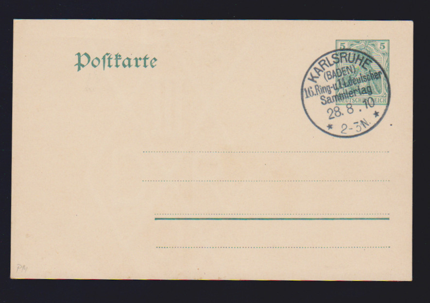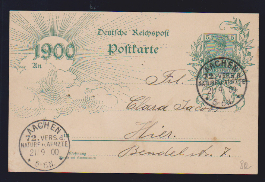 Sonderstempel, zwei Germania-Ganzsachenkarten 5 Pfg. mit frühen SST, 1900 "Aachen 72. Vers. d. Naturf. u. Aerzte", sowie 1910 "Karlsruhe 16. Ring- u. 14. Deutscher Sammlertag"