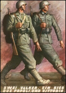 NS-Propaganda, seltenes Colorkarten-Paar "Zwei Völker, ein Sieg - Due Popoli, uno Vittoria" (bzw. umgekehrt) mit Abb. marschierender deutscher und italienischer Soldaten