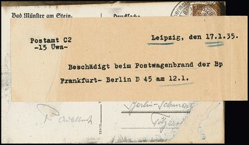 Katastrophenpost, 1935, Postkarte mit 3 Pfg. Hindenburg mit Etikette "Beschädigt beim Postwagenbrand der Bp. Frankfurt-Berlin D45 am 12.1."