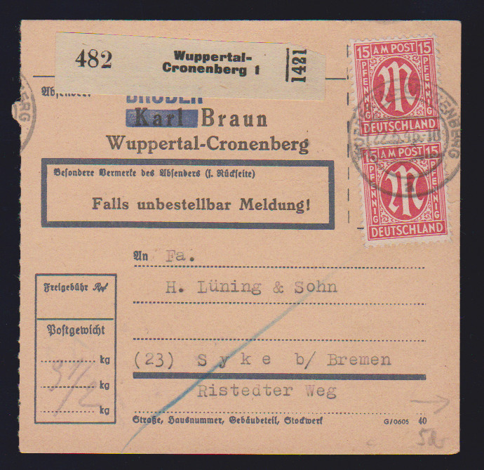 15 Pfg. per acht vs./rs. als gute Mehrfach-Frankatur auf Paketkarte 1946 aus Wuppertal-Cronenberg