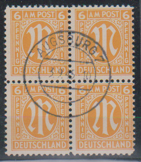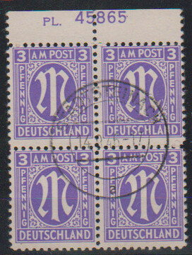 3 Pfg. AM-Post, zentr. gest. Oberrand-Viererblock mit Pl.-Nr. "45865", Fotoexp. Hettler. Mi. 120,-