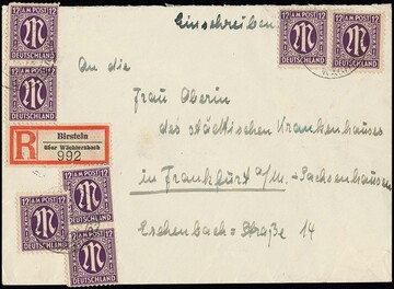 Amerikanischer Druck, zwei bessere Belege: 4 Pfg., x-Papier, als EF auf Drucksache, sowie 12 Pfg. violettpurpur, gutes za-Papier, per sieben (zwei etwas Randklebung) auf Bedarfs-R-Brief