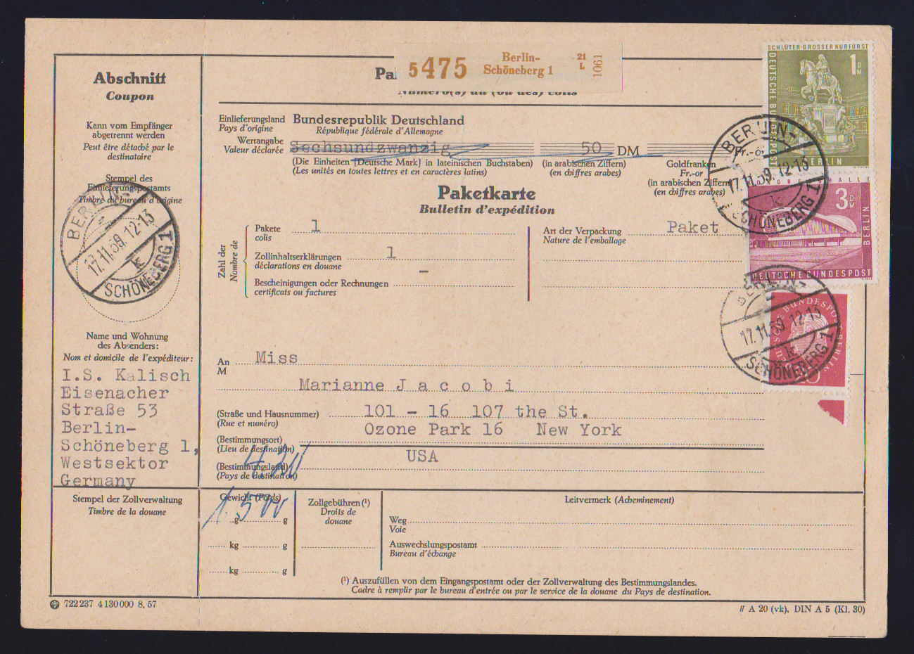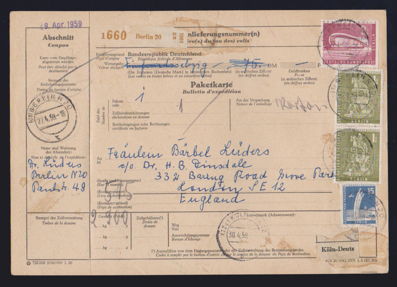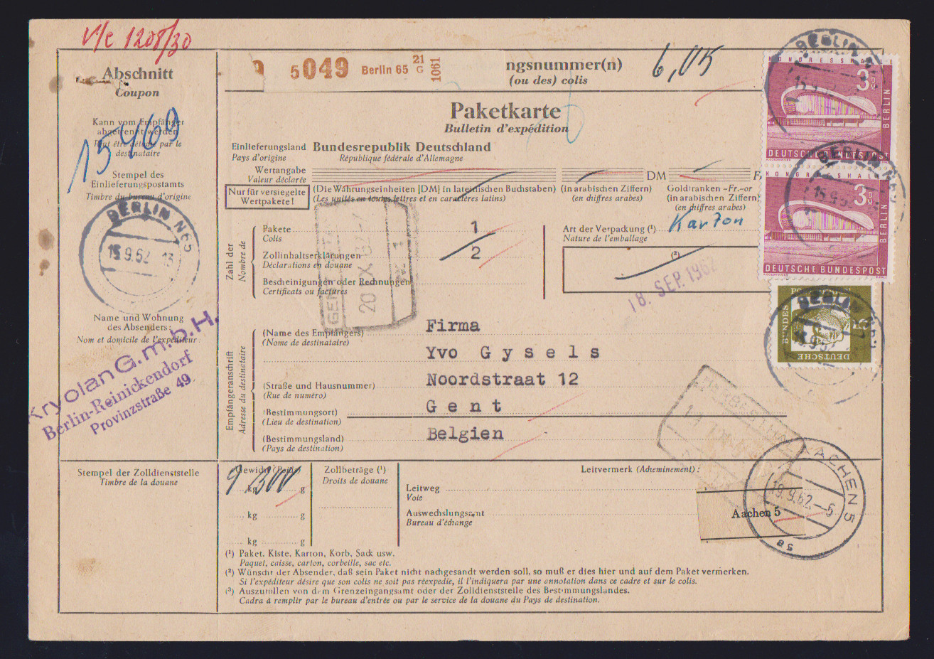 3 DM Kongreßhalle im senkrechten Paar, nebst 5 Pfg. Bedeutende Deutsche, auf kpl. Auslands-Paketkarte ab Berlin N 65, 15.9.62, nach Belgien