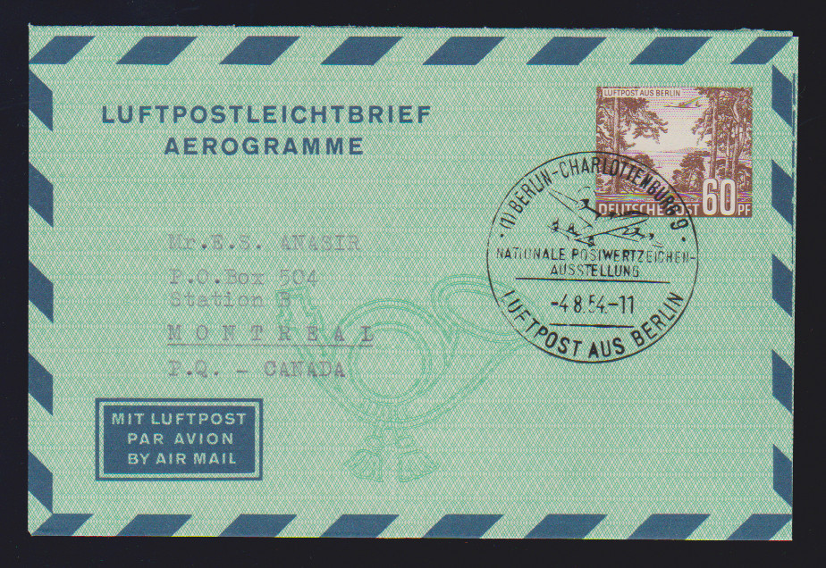 1954, Luftpost-Faltbrief-Ganzsache 60 Pfg. gelaufen von Berlin-Charlottenburg nach Kanada, Mi. 600,-