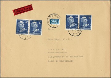 40 Pfg. Furtwängler, zwei Paare als gute hohe Mehrfach-Frankatur auf Auslands-Expreßbrief der 4. Gewichtsstufe von Bad Godesberg 1956 nach Frankreich