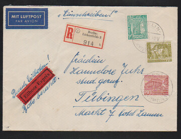 1 DM Stadtbilder, drei bessere Belege: vom Rand als EF auf Lupo-R-Doppelbrief ab Wilmersdorf, ferner nebst 5 u. 30 Pfg. auf Lupo-Expreß-R-Brief ab Lichterfelde, sowie nebst 50 Pfg. auf Auslands-Lupo-Eil-Doppelbrief ab Zehlendorf