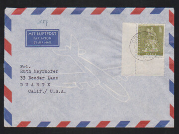 1 DM Großer Kurfürst, linke untere Bogenecke als Einzelfrankatur auf Lupo-Überseebrief in die USA